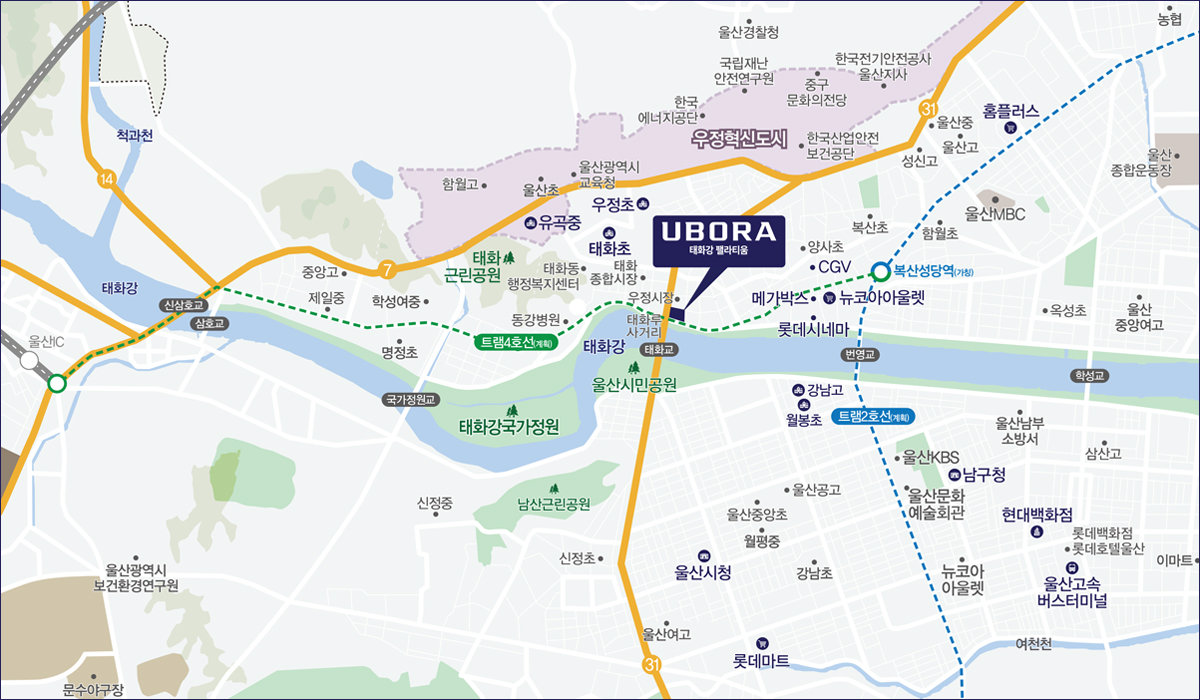 - 울산 트램 2호선, 4호선 개발계획 및 예정사항은 국토교통부고시 제2020-615호, 울산시청 자료를 참고하였으며, 추후 진행상황은 관계기관의 사정에 따라 변경, 축소, 취소될 수 있으며, 이는 당사와 무관합니다.